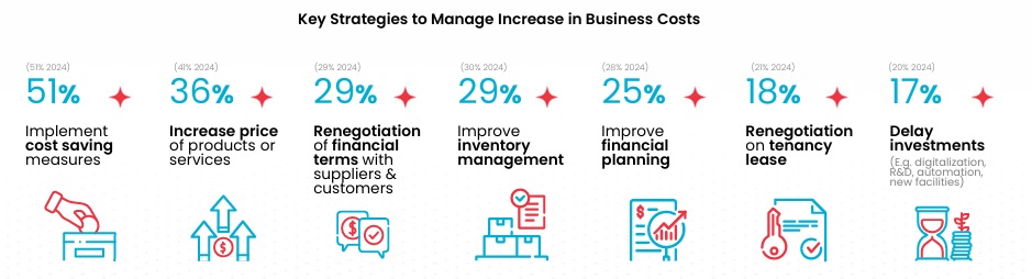 業種や企業規模によって影響度に差はあるものの、これらのコストは複合的に作用し、全体として利益率の圧迫につながっています。特に原材料価格やユーティリティ費用は企業規模で差が出やすく、SMEはユーティリティ、大企業は原材料コストの変動に敏感な傾向があります。