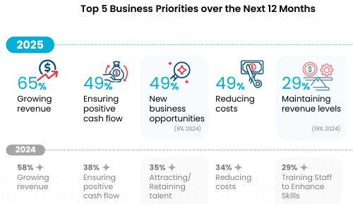 企業が今後12か月で重視する優先事項として、成長(売上拡大)、キャッシュフローの安定、コスト削減が上位を占めています。